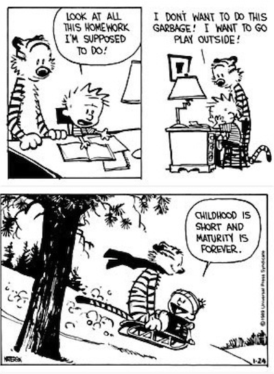 "Childhood is Short and Maturity is Forever" By Nishant Mehta in General — Dec 15, 2012 Calvin and Hobbes remains, to this day, one of my favorite cartoon series for its ability to capture reality, and for its fascination with the beauty and innocence of childhood.