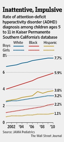 Jennifer Dooren writing in The Wall Street Journal on the rise in diagnosis of ADHD among children, especially in high-income homes: